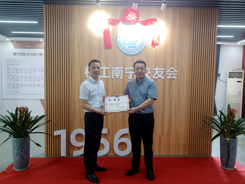 罗盛锋向南宁校友会英国上市公司365分会第一届会长,2004级市场营销和电子商务专业校友黄真强颁发了分会会长聘书。