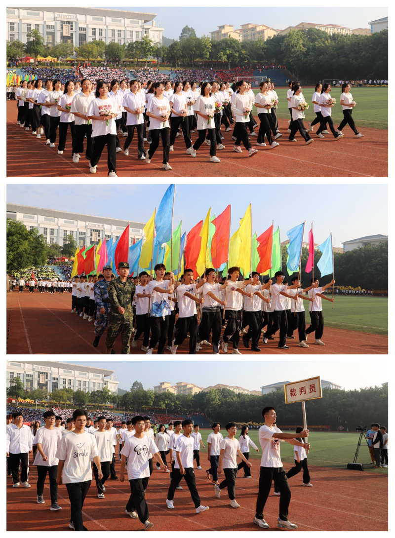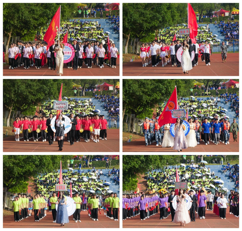 伴随着激昂的运动员进行曲,校国旗队队员们迈着铿锵有力的步伐护送校旗、校运会会旗进入会场,鲜花、彩旗、裁判员和各系方队紧随其后,迈着整齐划一的步伐陆续入场。各系结合专业特色进行了独具创意的方队表演,为大家呈现了一场气势磅礴的视觉盛宴。
