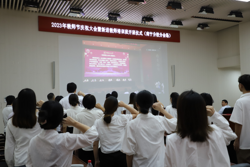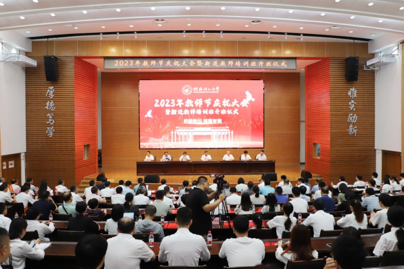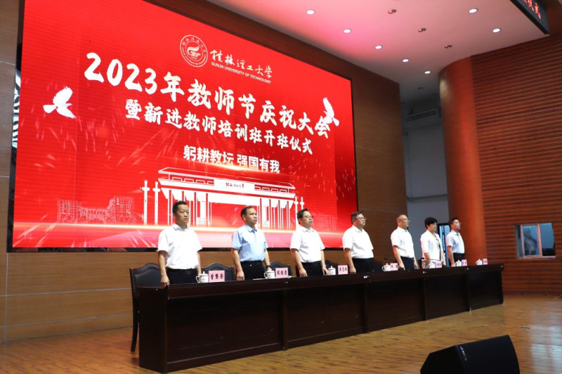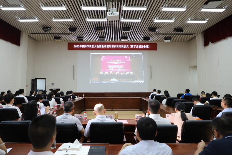 为深入学习贯彻习近平新时代中国特色社会主义思想和习近平总书记关于教育的重要论述精神,提高学校教师素质和教育、管理、服务水平,集中展示我校教师爱党爱国、仁爱奉献的精神风貌,打造一支堪当教育强国建设重任的新时代教师队伍,9月7日上午,学校在屏风校区图书馆报告厅举行2023年教师节庆祝大会暨新进教师培训班开班仪式。校领导邓军、王敦球、吴志强、王玫、周国清、韦学敏、曾繁荣出席会议。党委常委唐壮东、叶昊、邱杰,党委委员、校长助理张成龙,校长助理潘旦光,各单位、各部门负责人,荣休教职工代表,从教三十年教职工代表,2023年新进教师培训班参训学员,2022年培训班优秀学员以及师生员工代表参加会议。