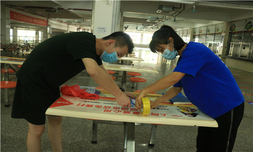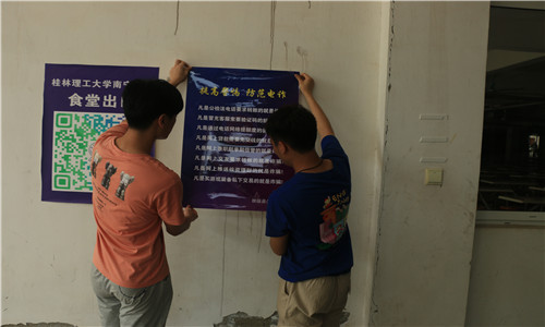 分校老兵团成员在食堂餐桌张贴防骗宣传单