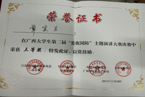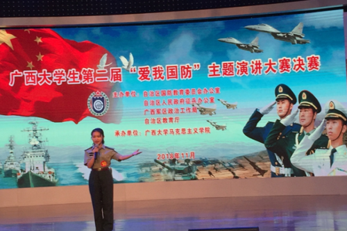 | | 为进一步做好高校国防教育工作,11月10日上午,由自治区国防教育委员会办公室、自治区人民政府征兵办公室、中国人民解放军广西军区政治工作局、自治区教育厅联合举办的广西大学生“爱我国防”主题演讲大赛决赛在广西大学举行。我校经济与管理系2017国际经济与贸易1班覃宾兰同学代表学校参赛,喜获三等奖。