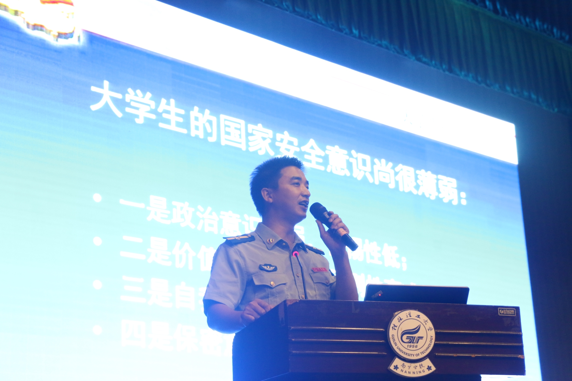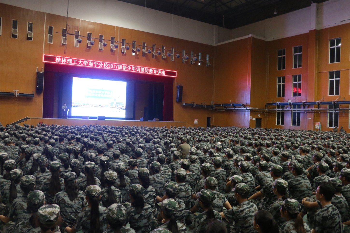 | | 根据《分校2017级学生集中军训方案》的安排,9月19日晚,在空港校区体育馆举办了新生国防教育暨征兵政策宣讲会。讲座邀请了分校监察室主任邹志友(原驻香港部队舰艇大队复转军人、预备役部队某连军官)作专题报告。分校保卫工作部负责人及全体军训团教官、师生参加宣讲会。