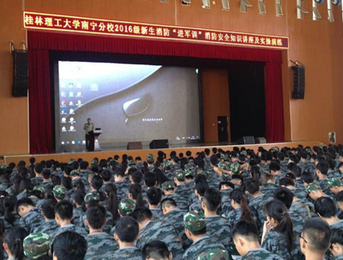 在体育馆内,扶绥县消防大队宣传员谭立结合高校消防工作的特点和典型火灾案例,运用通俗易懂、贴近生活的语言向军训新生阐述了校园消防安全的重要性,讲授了日常生活中火灾预防的措施和要求,传授了初起火灾处置和火场逃生的方法和要点。