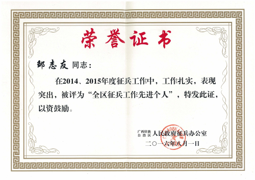 2016年8月1日,自治区召开征兵电视电话会议通报表彰2014、2015年度征兵工作先进个人,我校保卫工作部邹志友副主任荣获“全区征兵工作先进个人”。9月22日,崇左军分区副参谋长张松军上校到校颁发证书。