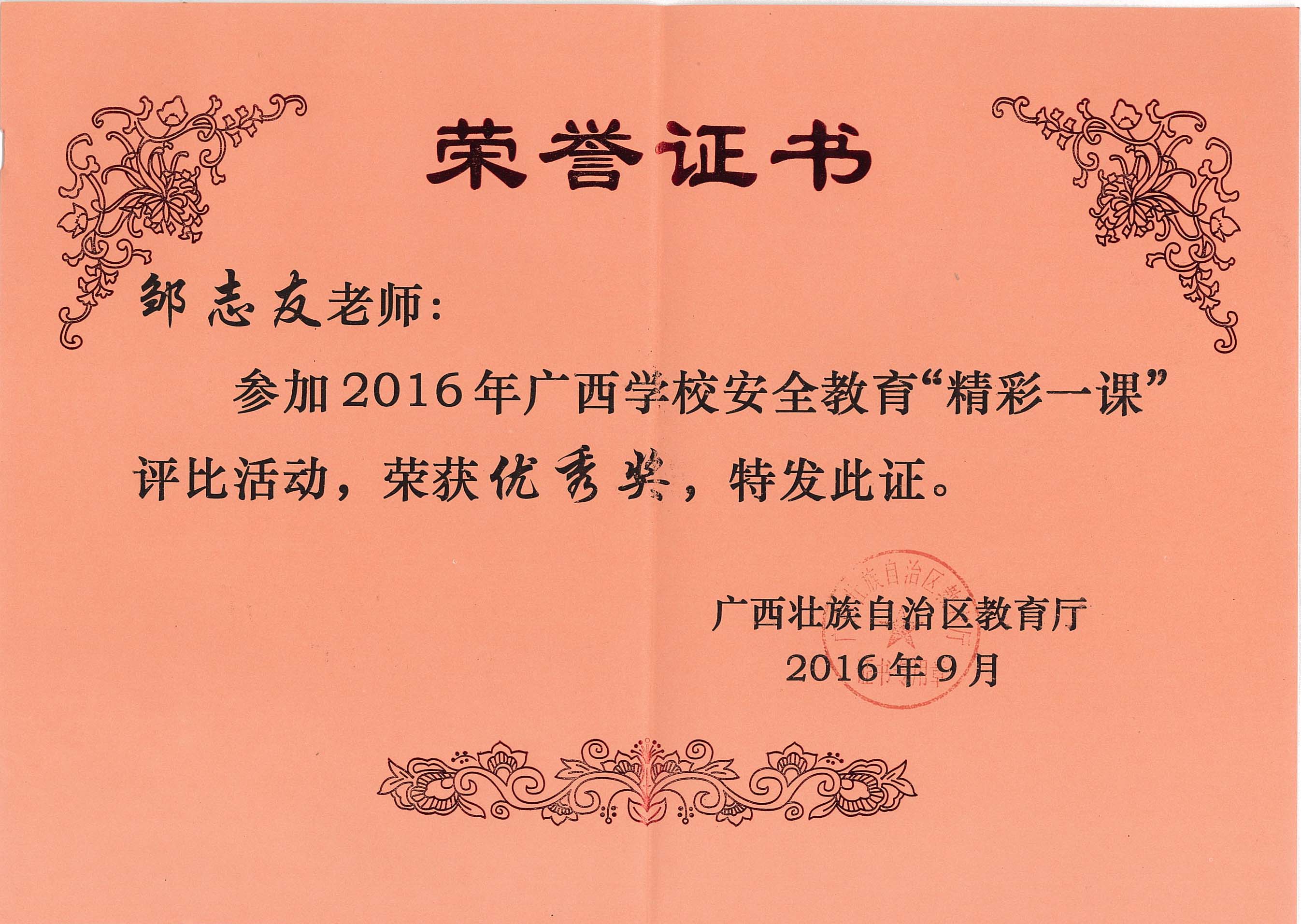 日前,由自治区教育厅组织举办的广西2016年安全教育“精彩一课”评选结果揭晓。分校教师邹志友在此次评比活动中荣获优秀奖。