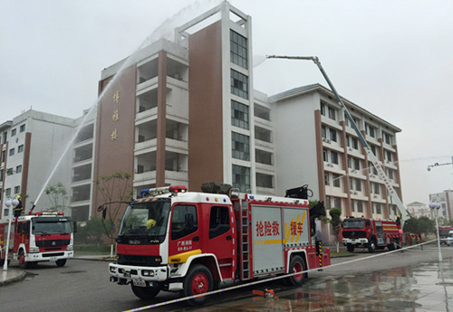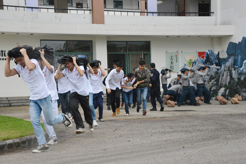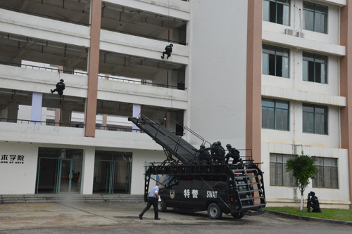 暴风骤雨过后,校园山体“巨石”不断滚落,砸坏一间教室窗户,教室内学生惊慌失措,老师迅速组织学生有序离开教室,应急分队赶赴现场,用盾牌阻挡山顶少量落石,为学生逃生争取有效时间并防止踩踏事件发生;4名“暴恐分子”闯入校园砍杀学生,应急分队火速赶赴现场用盾牌、应急棍、伸缩抓捕器、钢叉等器械对“暴恐分子”进行围捕;雷电之后引发火灾,实验室顿时火海一片,不断有师生从“火场”中冲出,实验室内和楼顶均有人员被困,消防人员赶到后迅速控制火势,利用登高平台和逃生气垫对被困人员进行救助,120医疗救护也赶到现场紧急处理伤者┄┄这是我校承办的2016年广西高校安全综合应急处置演练观摩会上的“片段”。