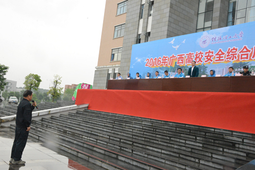 学校党委张学洪书记在演习开始前讲话,他首先向莅临现场的领导、嘉宾表示热烈欢迎。他说,安全稳定工作是学校的头等大事,一直以来,学校始终坚持把安全稳定工作作为重要工作来抓紧、抓实、抓好,以创建平安和谐校园为目标,以加强师生安全教育为主线,以加强“人防、技防、物防”建设为抓手,全力确保学校安全、稳定、文明、和谐。本次演练观摩会交由桂林理工大学承办,不仅是对我校应急处置工作的一次综合性检阅,同时也为我校学习全区各高校先进经验提供了一个良好平台。