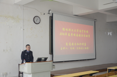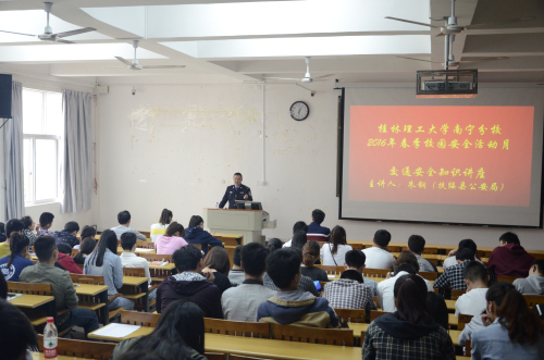 为了增强学生交通安全观念,提高学生交通安全意识,4月1日上下午,保卫工作部邀请了扶绥县公安局朱钢警官为我校2015级安全信息员,开展“文明交通,安全出行”为主题的交通安全讲座。