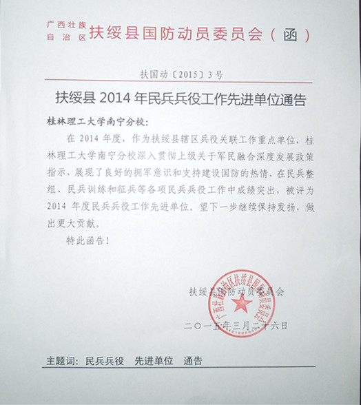 经过广泛宣传、积极动员、推荐报名、初检初审、上站体检、政治审查、入伍教育、定兵欢送等环节,2014年我校共有23名大学生光荣参军入伍。由于我校在征兵工作中表现突出,被评为“扶绥县2014年度民兵兵役工作先进单位”荣誉称号。