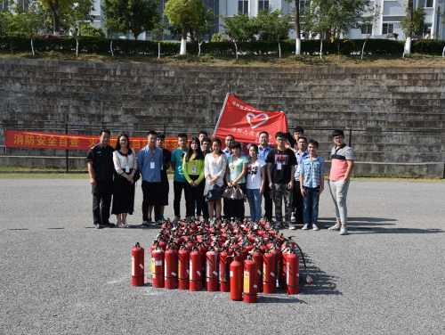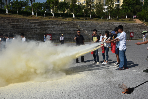 在活动现场,扶绥县消防大队官兵首先向在场师生讲解了灭火原理、灭火步骤、动作要领和演练注意事项,并现场演示了灭火器的使用方法。随后,学校各部门工作人员、星河物业公司员工、以及各系师生代表约500人分批次进行了现场消防灭火演练。