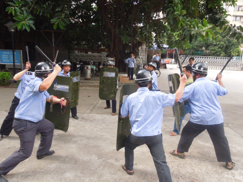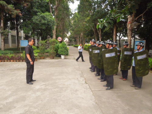 星河物业公司组织安吉全体保安人员进行校园安全防恐培训。主要是对保安进行擒敌、解脱基本技能的培训,并现场指导如何正确使用钢叉、盾牌、警棍、辣椒喷雾剂等防护装备。