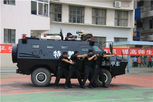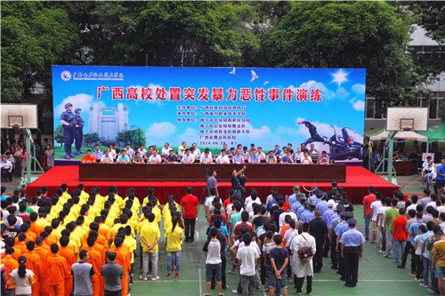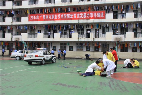 | | 为提升高校处置突发暴力恶性事件的快速反应能力,6月28日下午,由自治区高校工委、教育厅主办,广西电力职业技术学院承办,南宁市公安局高新区分局、南宁市公安局特警支队、南宁市公安局巡警支队高新警务站、南宁市消防支队高新大队、广西武警总队医院协办的广西高校处置突发暴力恶性事件演练在广西电力职业技术学院举行。自治区高校工委莫锦荣副书记、教育厅维稳处汪维处长及各协办单位、30多个驻邕高校的领导参加观摩,警员师生共200多人参加演练。演练活动由电力学院唐春生院长主持。