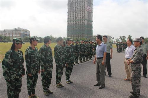 在空港校区体育场,军训团团长、崇左军分区边防三团易嘉昊少校向王文校长汇报了训练情况。王文校长听取了训练情况汇报后,代表学院对全体教官和指导员的辛勤付出表示感谢,并希望全体参训工作人员能够紧密配合、齐心协力,圆满完成本次军训工作。