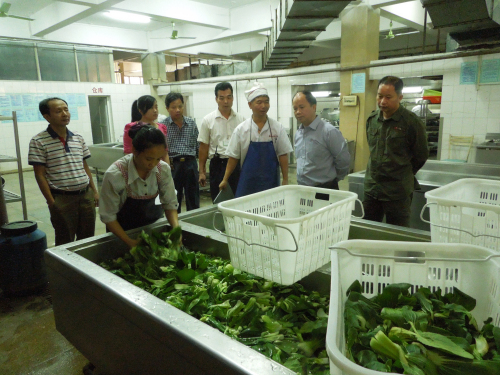 1、 饭堂基本情况:卫生环境比较好,员工都办有卫生证,餐厅以及厨房里面比较干净、清洁,生料与熟料能分开存放,按要求留样,消防栓配件完整、干粉消防灭火器完好;但饭堂窗口上有9块玻璃破裂。(建议后勤部:1、食堂使用大功率的电器较多,须购买6具3KG二氧化碳灭火器;2、尽快把破裂的玻璃换掉)。