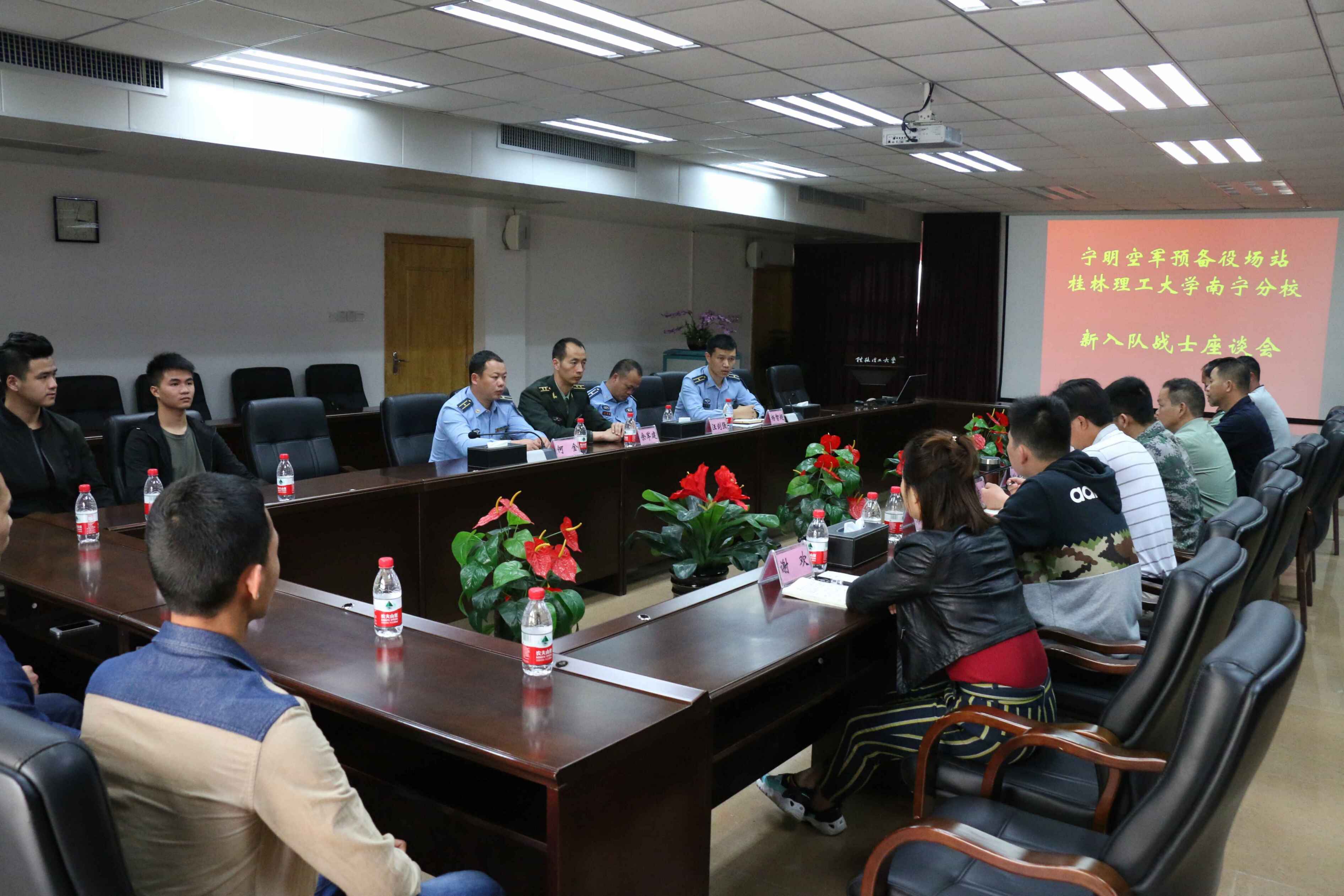 为了进一步做好预备役预编工作,3月23日下午,分校在行政楼416会议室召开宁明空军预备役场站新入队战士座谈会,扶绥县人民武装部军事科科长余军建、宁明空军预备役场站航空野外修理厂厂长杨智超、教导员汪剑强、副营长何金、分校保卫工作部主任陈发杰、分校老兵团指导老师邹志友、团委干事谢欢老师以及宁明空军预备役场站航空野外修理厂全体干部、分校老兵团代表参加会议,会议由保卫工作部副主任杜建同志主持。