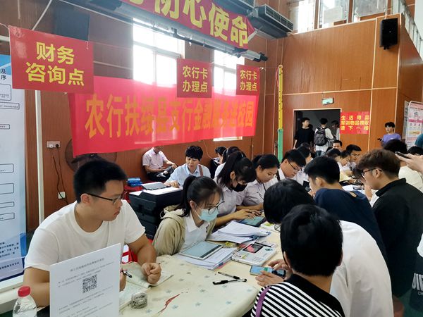 迎新当天,财务部设立了财务咨询服务点,现场为广大新生解答收费政策、学杂费缴费流程等热点问题。为方便新生办理银行卡(发卡、激活、签约)业务,财务部与农业银行扶绥县支行通力合作,特别设置银行卡办理窗口,让学生“足不出校”办业务。在做好服务的同时,为学生宣传普及金融防诈知识,帮助学生建立金融安全线,提高自我保护能力,筑牢校园安全屏障。