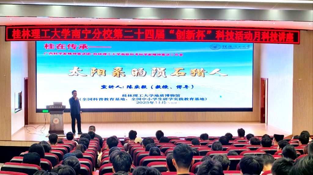 2025年11月14日下午,桂林理工大学地质博物馆副馆长、中国地质学会、矿物岩石地球化学学会科普工作委员会委员陈宏毅教授在8408报告厅作“太阳系的陨石猎人”专题讲座,英国上市公司365师生聆听讲座。