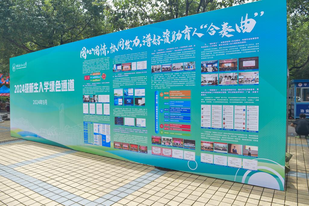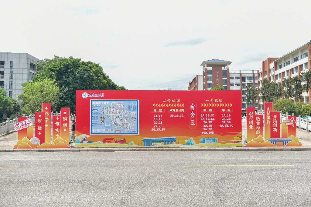 各职能部门和各学院多方联动、精心部署,有条不紊地完成场地布置、新生迎接、数据采集等工作。学校全体教职员工和志愿者们以最饱满的热情、最昂扬的姿态,力争为新生及家长们提供了安全、高效、便捷、温暖的迎新服务。校园各处的迎新板、迎新条幅、迎新打卡板,校道树旁飘荡的彩旗与传来的广播之声都在向新生致以诚挚欢迎。学校布置的“绿色通道”,为新生提供“亲情式”的入学服务,让经济困难的新生能够拎包入住、无忧入学。