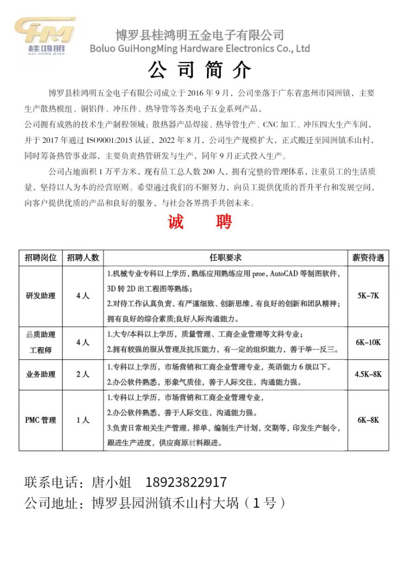 【招聘信息】(转)博罗县桂鸿明五金电子有限公司