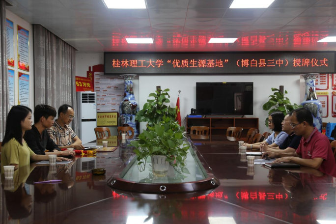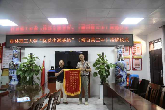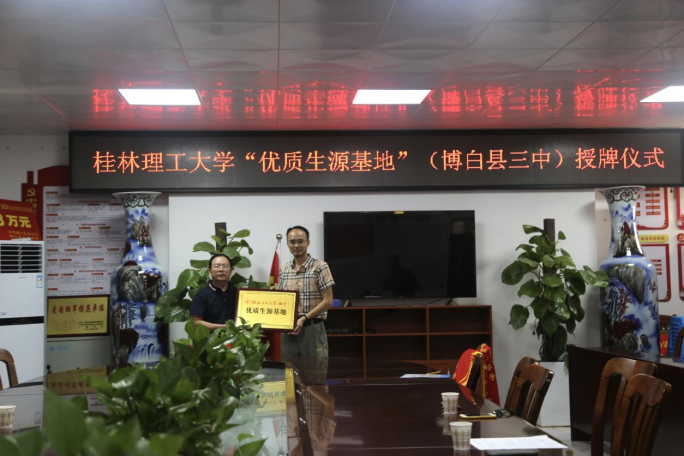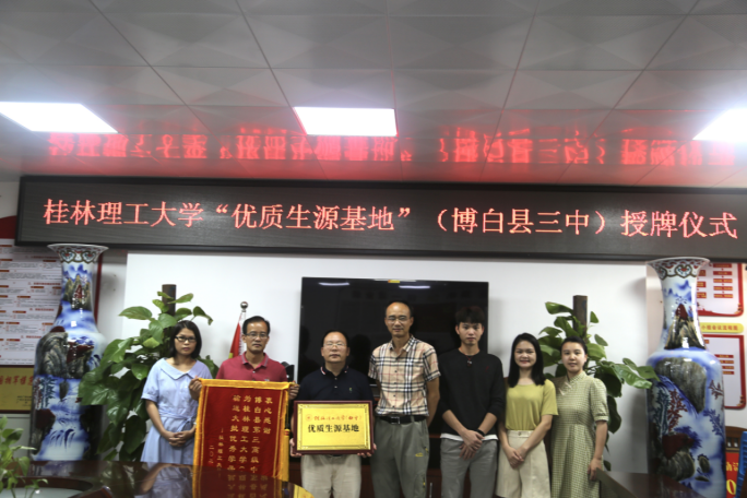 为表彰先进,树立典型,加强与生源地联系,提高生源质量,根据招就办与学工部工作安排,6月19日,我系主任周红锴、辅导员张华、韦艳莎老师、桂林理工大学英国上市公司3652020年度学生优秀人物通信18-本4班学生符梓良一行4人到博白县第三高级中学举行桂林理工大学(南宁)“优质生源基地”授牌仪式。