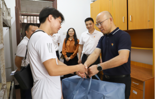 本次活动凝聚了电气系教师党员的热情和责任感。早上八点,教师党员们准时来到体育馆,布置现场,确保各项工作有条不紊地进行。他们胸前佩戴党员徽章,手持迎新标语,热情洋溢地迎接着新生们的到来。活动现场布置得热烈而温馨,党徽鲜明,为迎接新生营造了浓厚的党员氛围。迎新活动中,教师党员们积极与新生们亲切交流,分享学习经验和人生感悟,鼓励新生们要珍惜大学时光,努力学习,全面发展,为实现中华民族伟大复兴的中国梦贡献自己的力量。此外,系主任周红锴、书记甘锦琛和教师第一党支部副书记李崇山老师走访学生宿舍,慰问家庭困难学生,为其送床上用品,这份礼物虽然微不足道,但它承载着学校对学生的关心与鼓励。