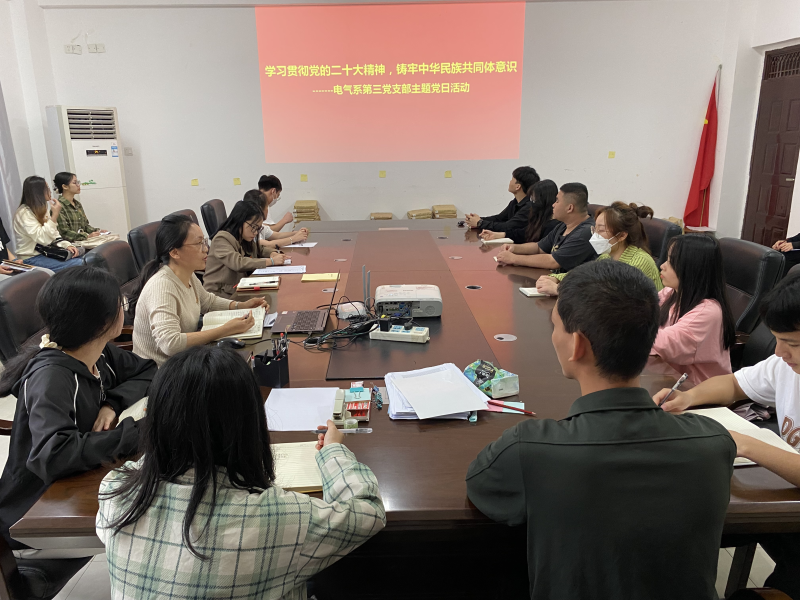 为贯彻落实党的二十大精神,深入推进学校铸牢中华民族共同体意识教育。电气与电子工程系第三党支部于2023年5月9日在玉成楼4208会议室开展“学习贯彻党的二十大精神,铸牢中华民族共同体意识”主题党日活动。活动由支部副书记姚鹏主持,支部全体党员参加活动。