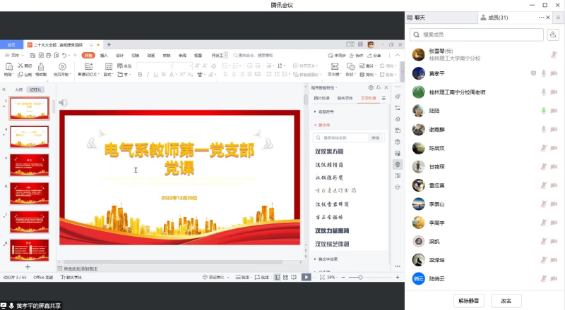 12月30日下午,我系第一党支部利用腾讯会议召开“学习贯彻二十大精神”专题党课。党课由党支部书记黄孝平主持,全体党员参加。