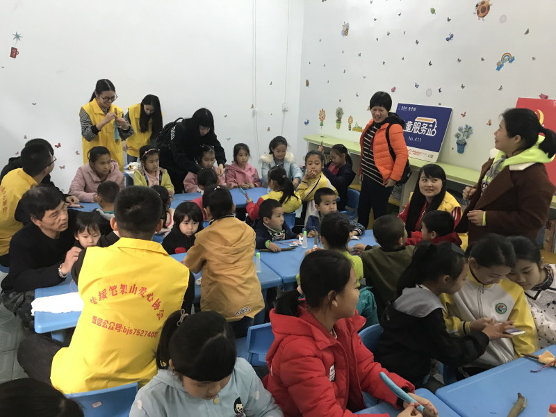 该支部志愿者到达目的地后,马上开展了手工制作课堂。他们分好工,将收集到的树枝、布条分发给小朋友们,以“一人主讲,多人配合”的方式教小朋友们做“树枝布偶娃娃”。他们耐心地指导小朋友们给“树枝布偶娃娃”穿衣服、画眼睛、贴嘴巴、涂颜色。经过一个小时左右的努力,小朋友们都制作出来了神态各异又生动形象的布偶娃娃,他们都露出了开心的笑容。