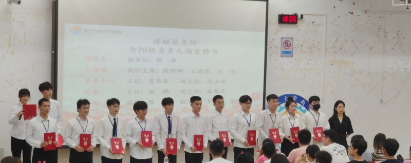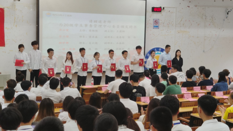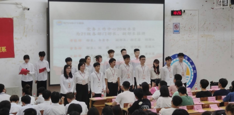 在国歌的演凑中,大会正式开始。首先是参会人员共同观看换届视频,这有着指导老师和21级干事对20级干事的祝福与期望。随后,由指导老师为各团体委员颁发聘书,上一届委员为新一届委员授牌。