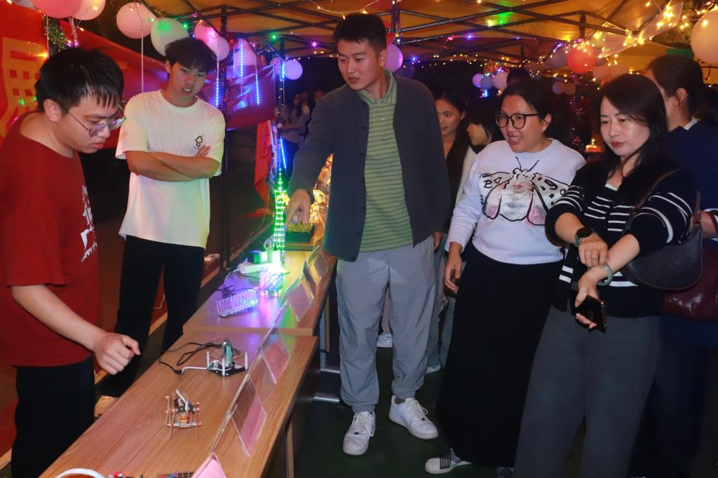 领导一行首先参观了学院学生科技创新作品展,观看了 “挑战杯”、“全国大学生电子设计竞赛”备赛作品的演示,与正在备赛的师生进行了亲切交流,详细询问项目创新点、技术难点和备赛进展。
