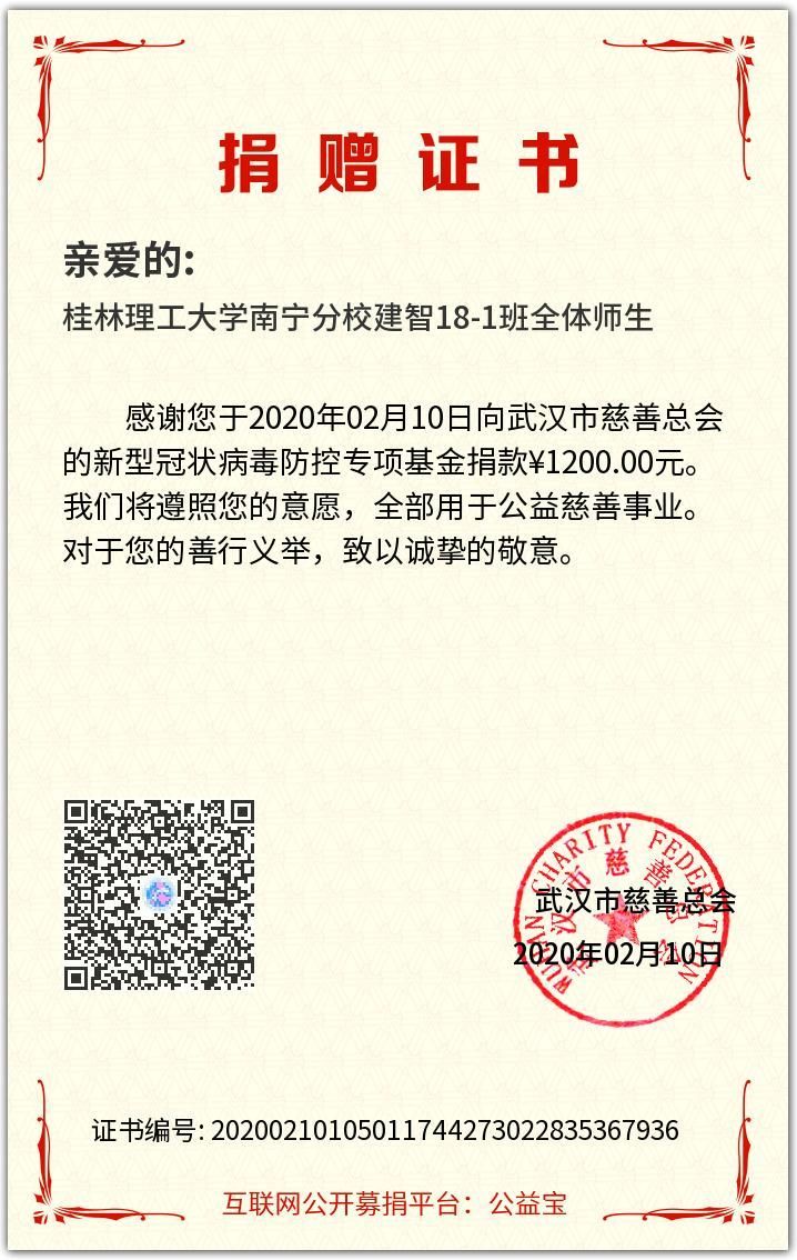 连日来,新型冠状病毒感染的肺炎疫情牵动人心每天刷新的病例数字令人揪心,一线医疗物资紧张让人焦急,2020年2月9日,电气与电子工程系建智18-1班毫不犹豫的发起爱心捐款倡议,呼吁大家能为抗击此次疫情贡献微薄之力,帮助武汉渡过难关。