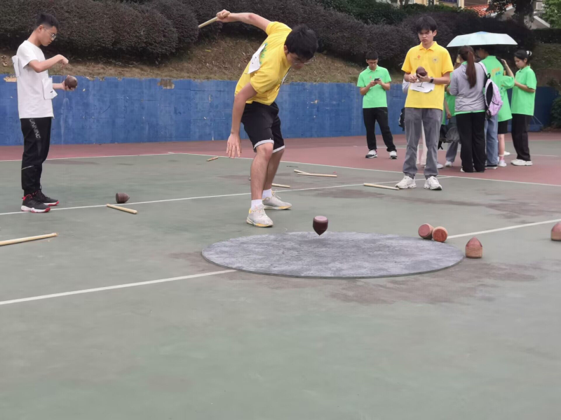 赛场上,运动员们缠绕好陀螺,一手握竿、一手举陀螺,瞄准,然后将缠绕陀螺的长线用力一抛,再迅速旋转身体,在长线带动下,抛出的陀螺瞬间飞出。最终,我系运动健儿荣获陀螺比赛第三名。
