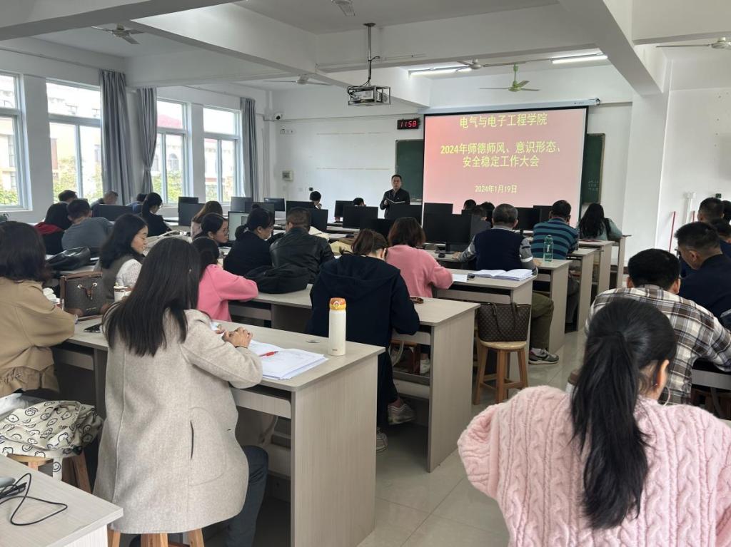 2024年1月19日,我院在玉成楼4402教室召开师德师风、意识形态、安全稳定工作大会暨班主任工作会议,学院领导班子及全体教职工出席会议,会议由学院党总支书记甘锦琛主持。