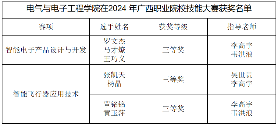 据悉,2024年广西职业院校技能大赛共设143个赛项,高职组有79个赛项;其中《智能电子产品设计与开发》和《智能飞行器应用技术》赛项分别在广西机电职业技术学院、广西农业职业技术大学举行,全区高职院校分别有45支、51支参赛队伍参加了本次比赛。经过激烈角逐,我院选手在《智能电子产品设计与开发》赛项中获三等奖1项,在《智能飞行器应用技术》赛项中获三等奖2项。