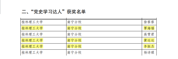 近日,由自治区党委党史研究室和自治区教育厅联合主办的“迎国庆、学党史”暨“传承红色基因、学思践悟中国共产党人精神谱系”知识竞赛活动圆满落幕。我院学生苏梦怡、王文荧在活动中获评“百强党史学习达人”,学生覃海福、黄运运、李挺杰获评“党史学习达人”。