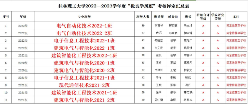 根据《桂林理工大学“优良学风班”创建考评办法》,为鼓励先进,创建良好的学习氛围,经班级自评,系部审核评选,拟定以下11个班级获评“优良学风班”,现予公示,公示期3天(2023年10月13日-2023年11月15日),公示期内如对获奖班级有异议,请持书面说明于2023年11月15日17:00前到4206办公室反映。联系人:李老师,联系电话:0771-5075966。