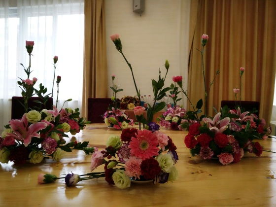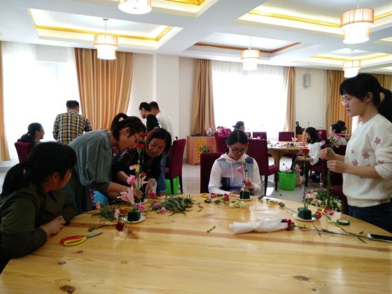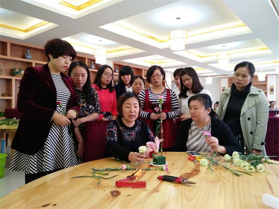 此次插花艺术培训由插花艺术理论知识学习、插花实操培训两部分组成。詹原教授首先从插花艺术概念、风格分类、西式标准花型插制原则及基本操作流程四个方面进行了详细的讲解。接下来詹老师分步骤进行实操示范,从如何识别花材开始解析,重点讲解了如何根据不同的花器插花进行构思和技术处理,以及如何整理和修剪花材和插花时所需注意的事项。参会女教职工积极参与、热情互动,在教师指导下精心构思,认真修剪,制作出了一件件春意盎然、清雅别致的插花艺术作品。大家看着自己的劳动成果高兴地说:“今天不仅学会了简单的插花制作技巧,更是学会了在日常生活中如何去欣赏美、发现美、并创造美的插花艺术作品,为生活增添艺术缤纷色彩”。