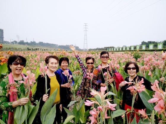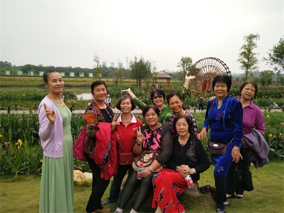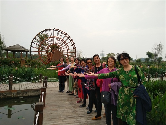 清风送爽丹桂香,槿艳繁花满树红,红艳的朱槿花迎风招展迎接我们的到来。退休教职工们兴致勃勃地漫步在木制的临水步道上,绿油油的草坪顺着河岸延伸开来,成片的美人蕉,形成了片片色彩斑斓的花海,河水清可见底,微风吹过,带来青草、鲜花的芬芳。退休教职工们个个精神焕发,三三两两,不紧不慢,结伴徜徉在花海美景中,停驻凉亭、水车、木桥旁,摆个姿势,留下美景,嗅着花香,赏着美景,喜笑颜开,其乐无穷。累了,大家便倚靠围栏眺望远观,感受绿色生态清新的气息。
