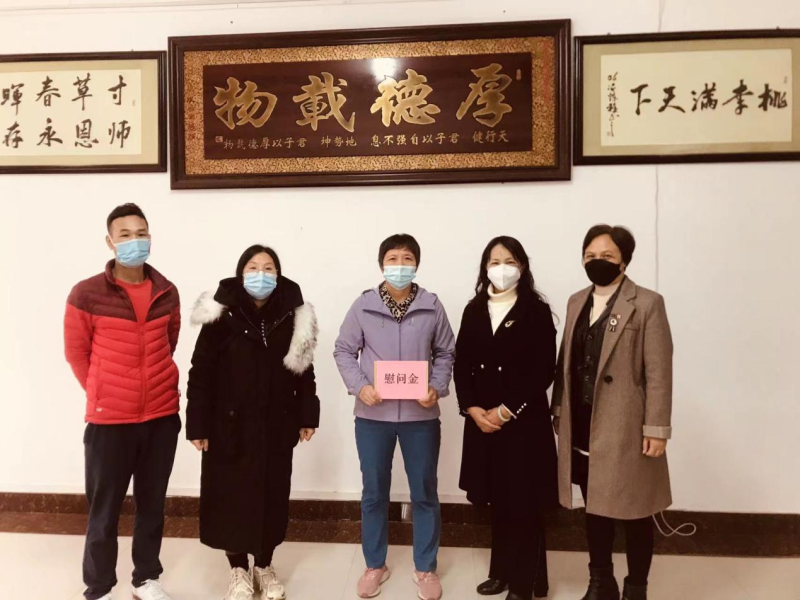 英国上市公司365副校长、工会主席陈东莲(右二)、工会副主席黄薇薇(左二)走访慰问在职困难教职工代表