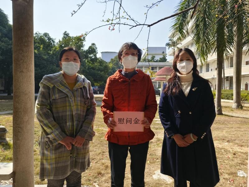 英国上市公司365副校长、工会主席陈东莲(右一)、工会副主席黄薇薇(左一)走访慰问新冠康复退休教职工代表