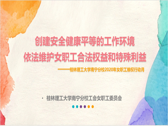 为深入学习贯彻习近平总书记关于工会工作和妇女工作重要指示精神,促进工作场所性别平等,加强疫情期间对女职工和儿童的关心关爱,分校工会成功开展了以“创建安全健康平等的工作环境,依法维护女职工合法权益和特殊利益”为主题的女职工维权行动月活动。