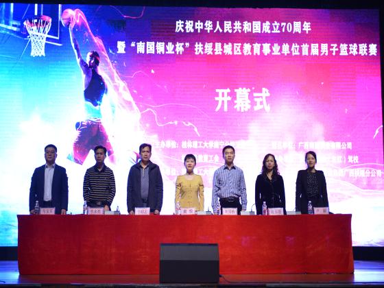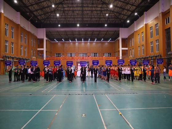 为庆祝中华人民共和国成立70周年,讴歌伟大中华人民共和国成立70周年光辉历程,贯彻落实自治区体育局和自治区总工会《关于进一步加强广西职工健身活动工作的实施意见》(桂体发〔2019〕11号)精神,进一步推动全民健身活动广泛深入持久开展,丰富职工群众文化体育生活,保证教职工社团活动月各项工作有序进行,同时加强扶绥县教育系统各单位之间交流,充分展示扶绥县广大教师、教育工作者“团结、和谐、拼搏”的精神风貌,11月25日傍晚,“庆祝中华人民共和国成立70周年暨‘南国铜业杯’扶绥县城区教育事业单位首届男子篮球联赛”在我校空港校区体育馆盛大开幕。