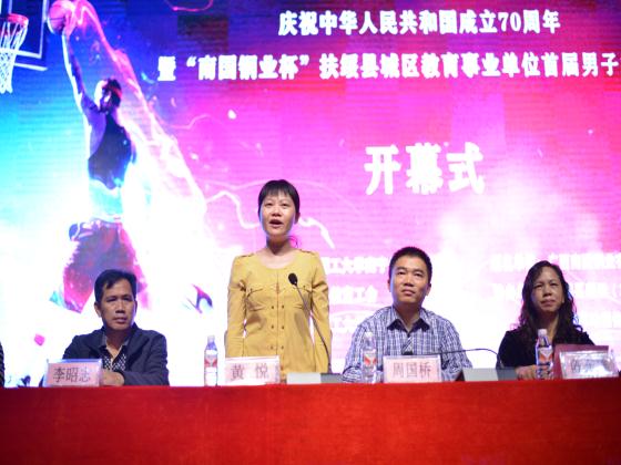 在运动员和裁判员代表进行宣誓后,扶绥县委常委、宣传部部长、副县长黄悦宣布了庆祝中华人民共和国成立70周年暨“南国铜业杯”扶绥县城区教育事业单位首届男子篮球联赛开幕。