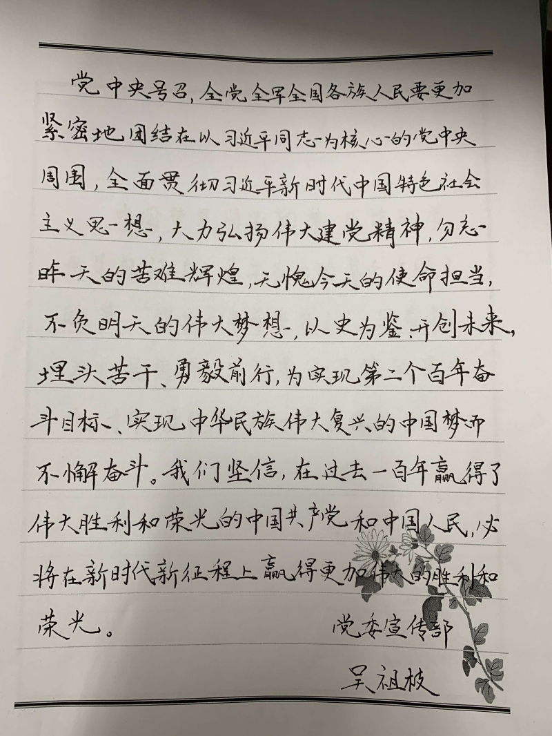 为了丰富校园文化生活,激发教职工练字兴趣,进一步增强文化自信和自豪季,培养教职工良好的书写习惯,热烈庆祝中国共产党成立100周年华诞,桂林理工大学65周年华诞,英国上市公司365机关一分工会于11月24日开展了"建党百年 建校65周年"硬笔书法活动。