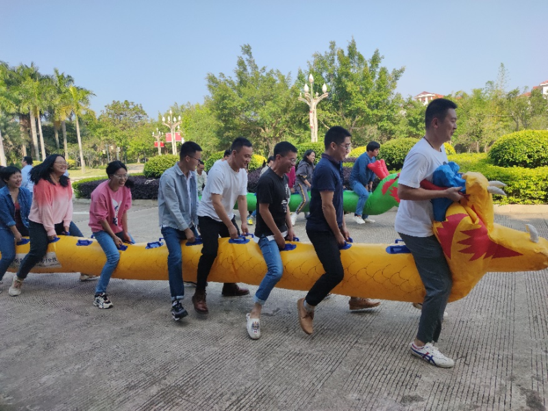 活动采取分组比赛的方式进行,分工会共分成5个参赛队伍。比赛前,各队成员需两脚跨着“大龙”,并排在起跑线上,裁判喊“开始”,两队齐出。五组比赛下来,到达终点用时最少的队伍获胜。