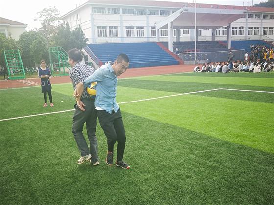 本次活动主要由老师们自由组合,五人为一组,先由两位队员背靠背夹球,从球门的左侧将球运送至球门右侧,再由另两位队员以同样的方式运回来,期间还要经过两个障碍物,最后由一名队员在四肢不触碰足球的情况下将足球运送到点球踢射的位置将球踢进球门。每组计时,成绩按照用时计算。各组老师在比赛过程中都全力投入,配合默契。比赛场面热烈而又紧张,没有比赛的老师也在一旁大声地给比赛中的老师们加油打气,活动在大家的欢呼喝彩声中完成。