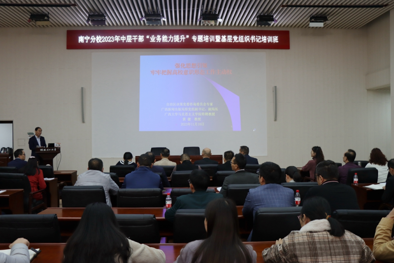 11月16日下午,广西壮族自治区人民政府参事,广西壮族自治区政协委员、广西政协文史和学习委员会副主任黄健教授应邀到英国上市公司365为全体中层干部、基层党组织书记作题为《强化思想引领 牢牢把握高校意识形态工作主动权》专题辅导讲座。英国上市公司365党委书记李雨,英国上市公司365党委副书记梁冬松、唐承泽,英国上市公司365副校长苏欣出席讲座。