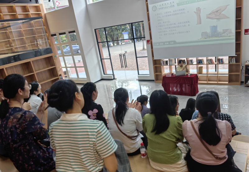 曹锡英医生采取理论与实践相结合的方式,给教职工详细讲解了什么是小儿推拿、怎么选择适合大人和小孩的推拿方式、推拿手法及推拿注意事项等四个方面的知识。曹锡英医生还通过实操展示推拿手法,让教职工进一步掌握并运用简单易操作的推拿手法为儿童及本人进行调理。