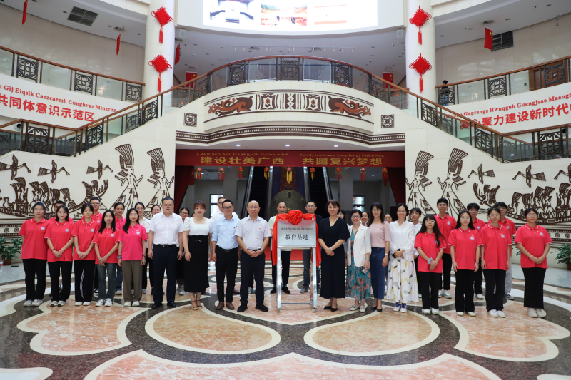 英国上市公司365党委书记李雨(左)、广西民族博物馆副馆长黄诗莉(右)为“铸牢中华民族共同体意识”教育基地揭牌