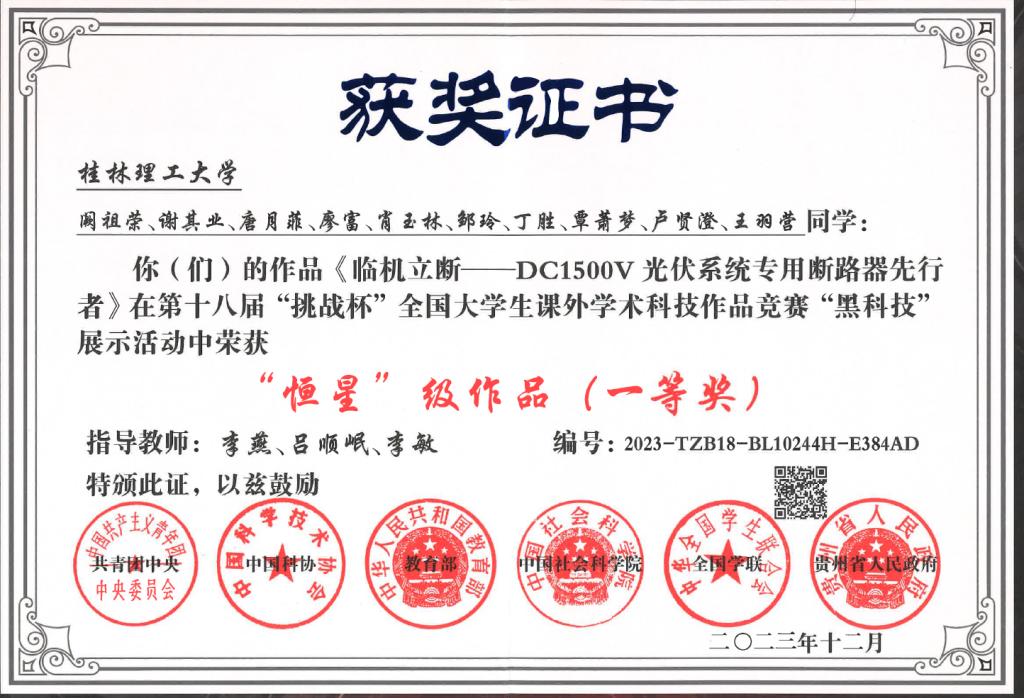 党员教师指导学生团队获第十八届“挑战杯”全国大学生课外学术科技作品竞赛“黑科技”展览活动“恒星”级作品(一等奖)